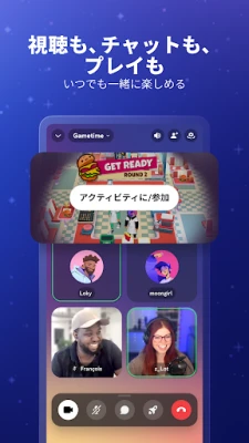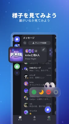 誰がオンラインで、何をプレイしているのかが一目瞭然。Discordを通じて、サポートされているゲームにおける友人のモードやキャラクターを確認し、彼らの冒険に直接参加することも可能です。友人と一緒に動画を鑑賞したり、Discord謹製のゲームで盛り上がったり、音楽を聴き合ったり、ミームを送り合ったりと、様々な共同アクティビティを楽しめます。テキスト、ボイス、ビデオ通話、そしてゲームプレイの間をスムーズに切り替えながら、途切れることのない共有体験を提供します。PC、スマートフォン、ゲーム機、どのデバイスからでもDiscordで友達と集まれ、デバイス間の移行も驚くほど簡単です。